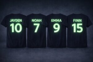 Dit glow t-shirt laat naam en rugnummer oplichten in het donker.